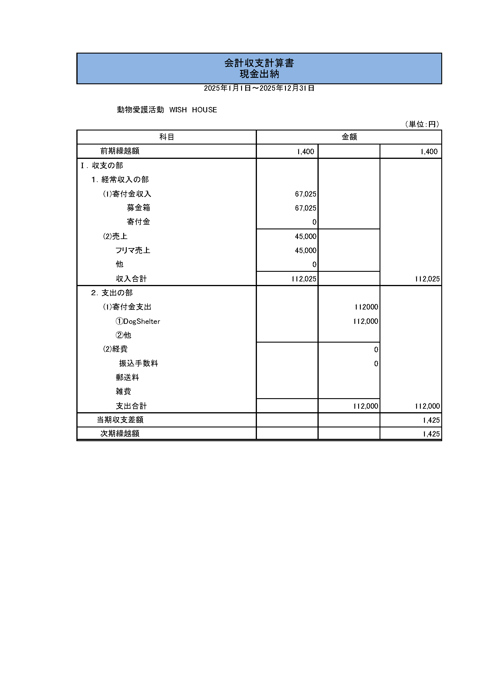 WISH HOUSE 2025年度会計報告 2025年の収支報告をです。(2025年1月~12月) 店頭募金及びフリマ売上(ご提供いただきましたペット用品、他)にご協力いただき 誠にありがとうございました。