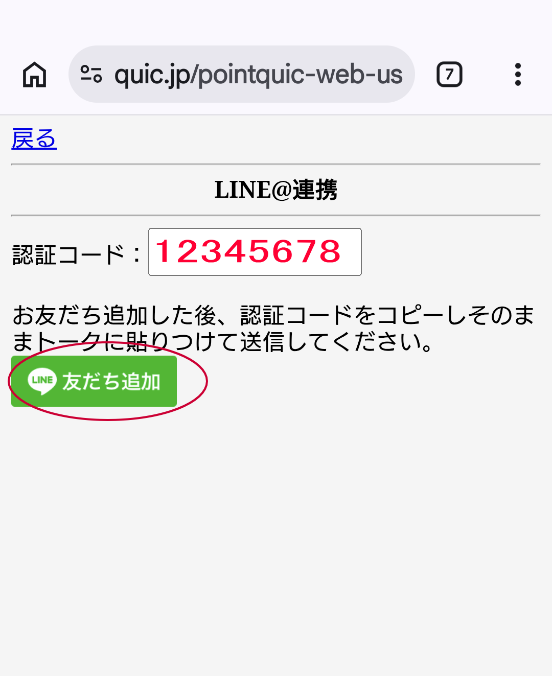 「友だち追加」ボタンを選びます※認証コードは変更したり、消したりしないでください。