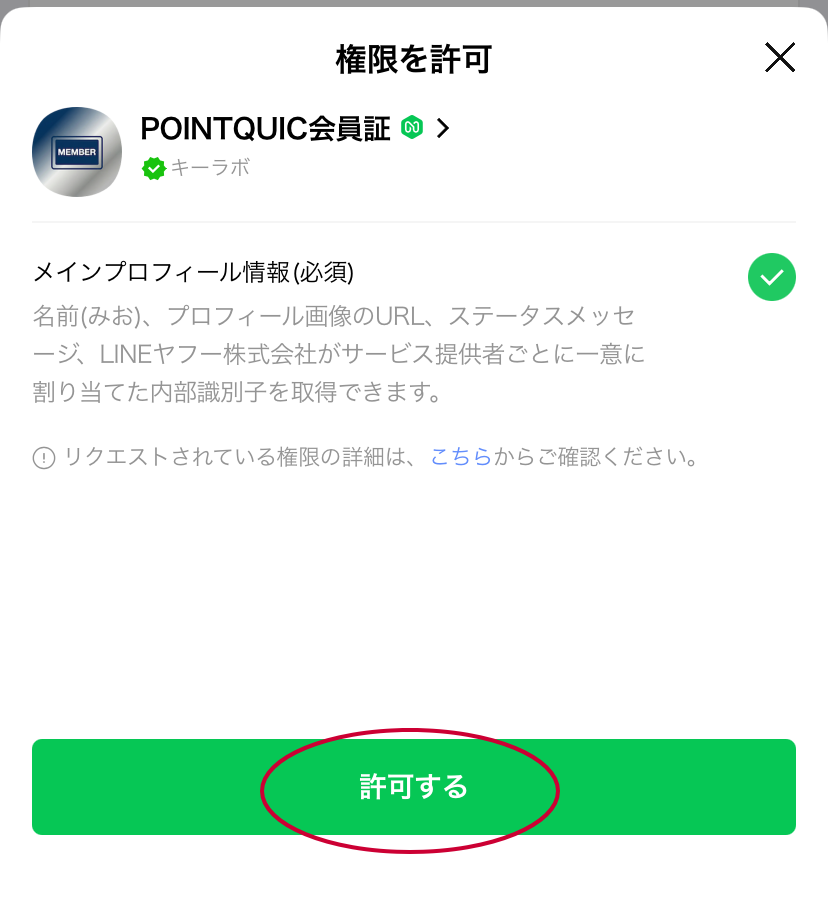 POINTQICKの権限を 「許可」 「LINEと連携が成功しました」を確認